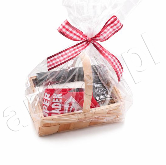 - cały koszyk zapakowany jest w przezroczystą folię i przewiązany czerwoną kokardą w kratkę