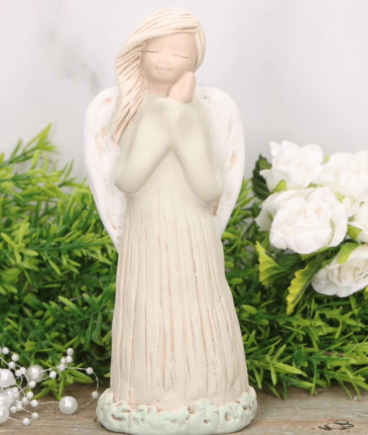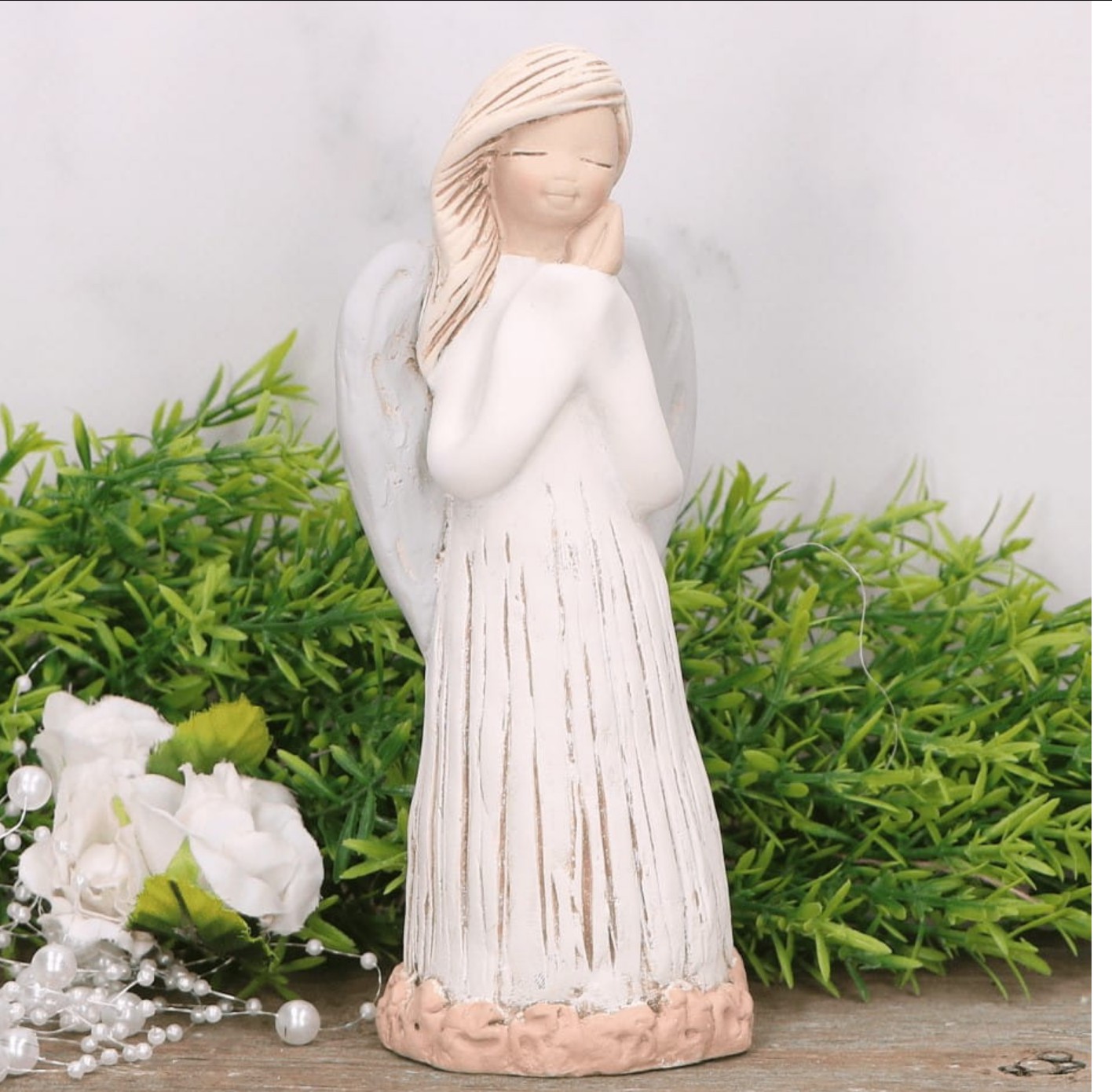 Anioł gipsowy z kwiatami biały 11 cm