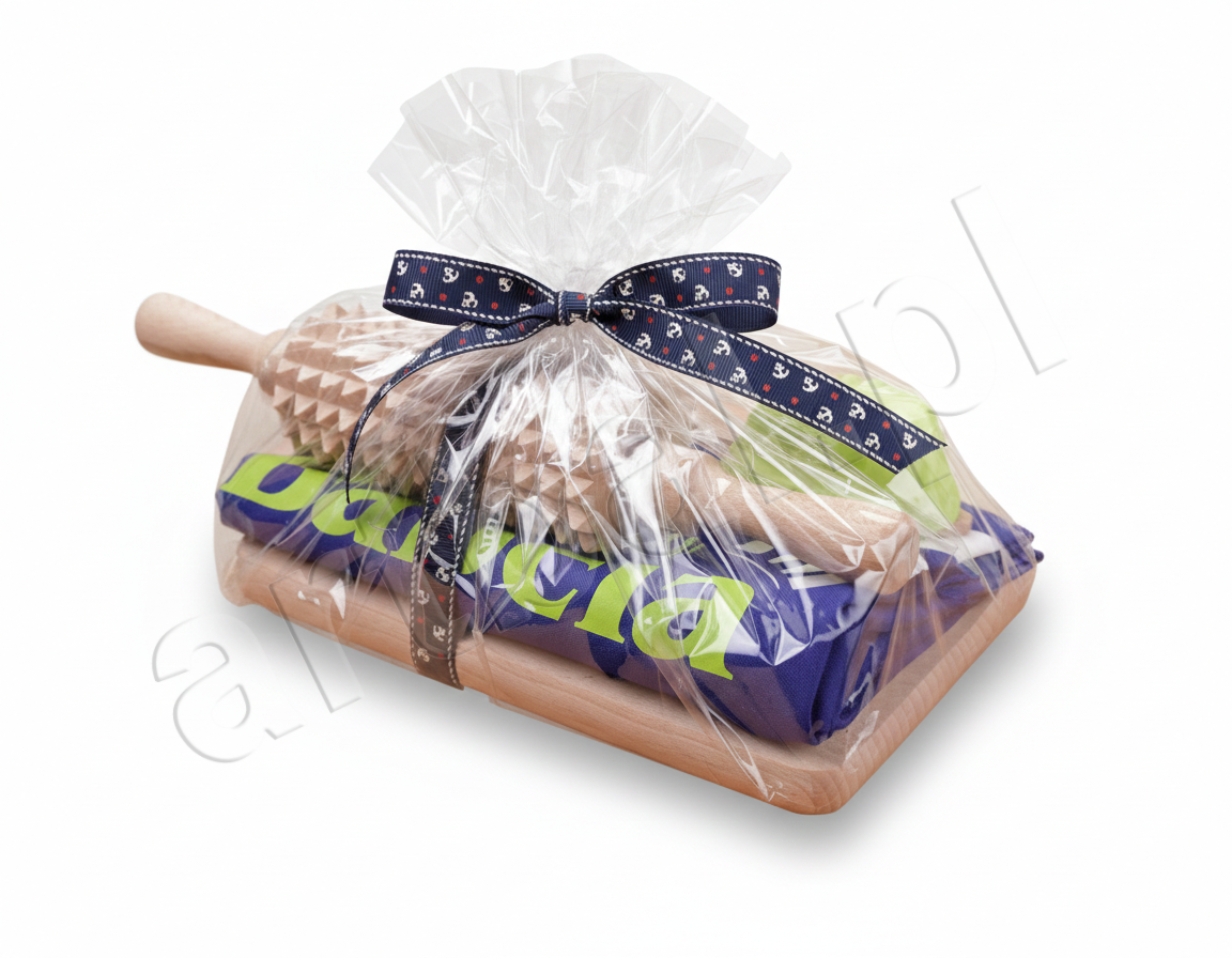 - zestaw jest zapakowany i przewiązany granatową kokardką